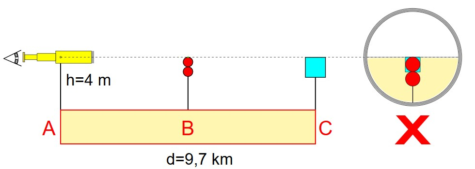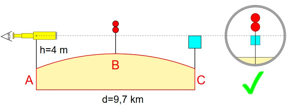 Si la Tierra fuera plana los discos tendrían que aparecer a la misma altura que el marcador del final (un cuadrado azul). A la derecha podemos ver lo que se vería por el telescopio.