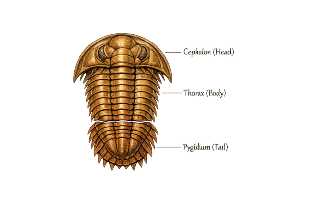 Trilobites. Cefalón (cabeza), Cuerpo (Tórax) y Cola (Pygidium). Imagen creada por Copilot de Microsoft.
