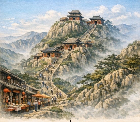 El monte Tai, con las tiendas de recuerdo a su pie. La imagen la he creado con IA, con ayuda de Copilot de Microsoft.