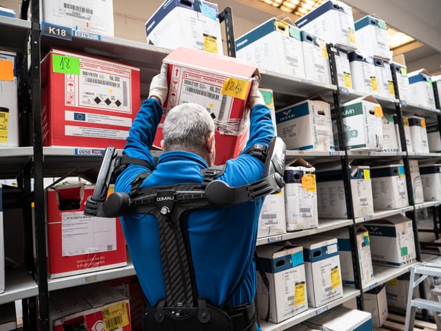 El Exoesqueleto Pasivo MATE-XT de Comau empleado en una actividad de logística. El exoesqueleto ayuda a subir paquetes pesados. By UsaChan93 – Own work, CC BY-SA 4.0, https://commons.wikimedia.org/w/index.php?curid=117829372