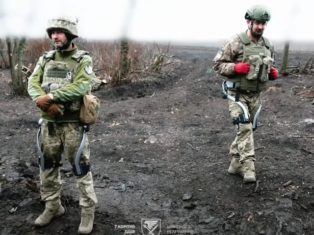 Fotografia gentileza del ejército ucraniano. Concretamente del 7.º Cuerpo de Asalto AéreoDos militares ucranianos mostrando el exoesqueleto que pesa unos dos kilos y que puede llevarse en un maletín. La foto es gentileza de las Fuerzas Armadas Ucranianas.