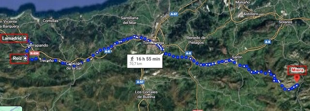 Ruta desde Lamdrid, a la izquerda, Roiz, un poco más al sur, y Miera, muy al este.