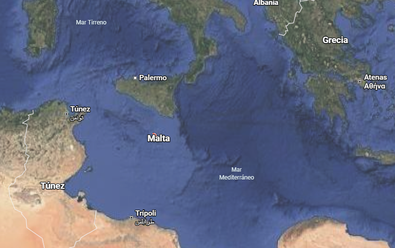 Ubicación de Malta entre el Mediterráneo oriental y el occidental. Cerca de Sicilia y no lejos de Túnez o Trípoli